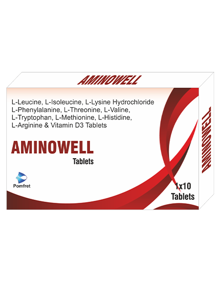 L-leucine 101 mg, L-isoleucine 67mg, L-lysine HCL 75mg, L-phenylalanine 68mg, L-threonine 53mg, L-valine 86mg. L-tryptophan 23mg, L-methionine 59mg, L-Histidine 38 mg, L-Arginine 100 mg, Vit D3 600 IU. Tablet
